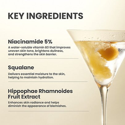 Water, Glycerin, Niacinamide, Sodium Hyaluronate, Propanediol, Erythritol, Butylene Glycol, Squalane, Oryza Sativa (Rice) Bran Extract, Calendula Officinalis Flower Extract, Carica Papaya (Papaya) Fruit Extract, Hippophae Rhamnoides Fruit Extract, Malpighia Emarginata(Acerola)Fruit Extract, Polyglyceryl-10 Laurate, Chlorphenesin, Arginine, Ethylhexylglycerin, Carbomer, Glutathione, 1,2-Hexanediol, Hydroxypropyl Cyclodextrin, Disodium EDTA, Hydroxyethylcellulose, Allantoin, Rosmarinus Officinalis (Rosemary) Leaf Oil
